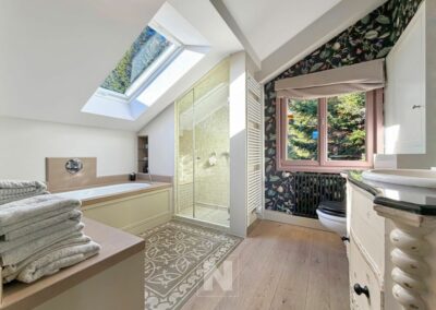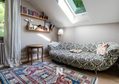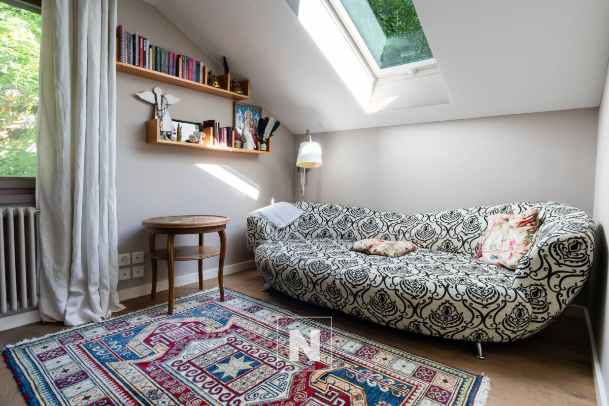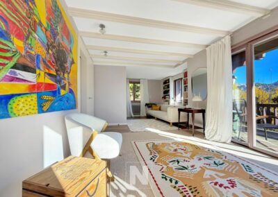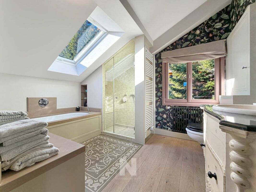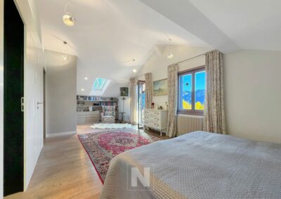 Upstairs, the master bedroom, bathed in light until the evening, has a spacious bathroom with a bath and shower. Adjacent to a relaxation area/library and a cosy study, it opens onto a charming balcony facing almost due south, offering superb views of the mountains.