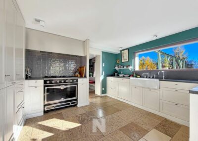 The interior, inspired more by the spirit of a contemporary villa than that of a traditional chalet, captivates with its bright spaces and refined aesthetics. The high-end kitchen, equipped with a La Cornue stove, invites both conviviality and culinary creativity.