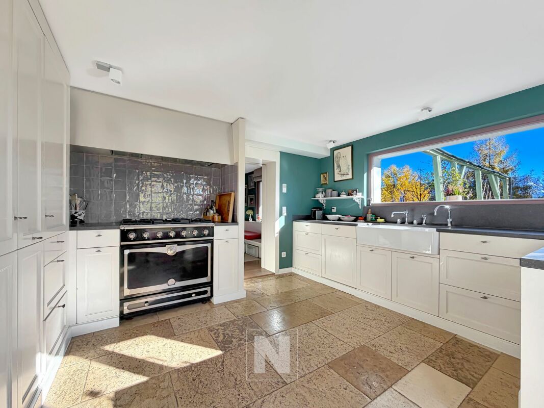 L'intérieur, davantage inspiré par l'esprit d'une villa contemporaine que par celui d'un chalet traditionnel, séduit par ses volumes lumineux et son esthétique épurée. La cuisine haut de gamme, équipée d'une cuisinière La Cornue, invite aussi bien à la convivialité qu'à la créativité culinaire.