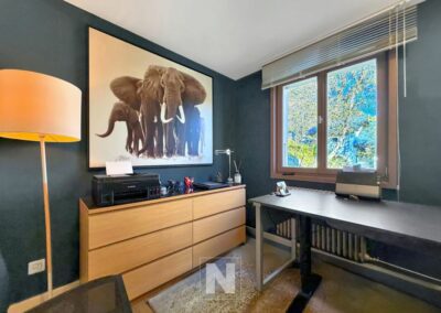 À l'étage, la chambre parentale, baignée de lumière jusqu'en soirée, bénéficie d'une spacieuse salle de bain avec baignoire et douche. Attenante à un espace détente/bibliothèque et à un bureau cosy, elle s'ouvre sur un charmant balcon orienté presque plein sud, offrant une superbe vue sur les montagnes.