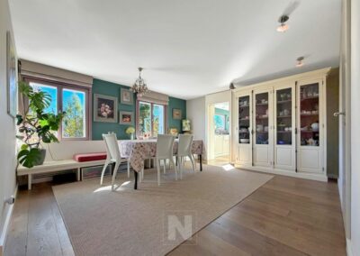 On the ground floor, the custom-designed dining room is warm and welcoming, perfect for enjoying meals with family or friends. The adjoining kitchen, equipped with top-of-the-range appliances, opens onto the garden and surrounding nature. This floor also features a sauna, an adjoining bathroom and a bedroom/study.