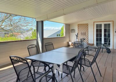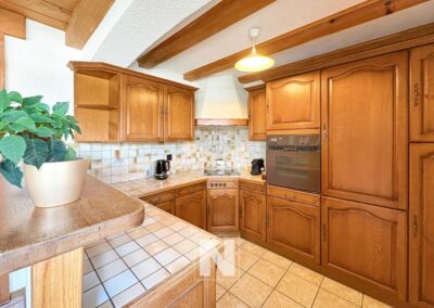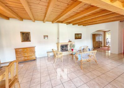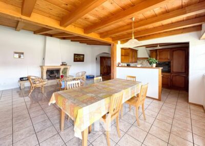 Il y a une grande salle à manger avec cheminée et sur le côté une cuisine ouverte entièrement agencée avec bar.