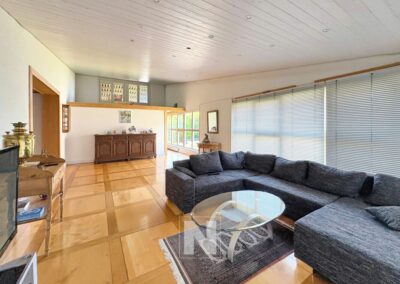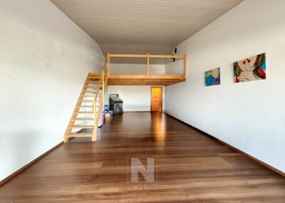 Le séjour dispose de plusieurs vitrages ce qui le rend magnifiquement lumineux avec un très beau parquet et une mezzanine pouvant faire office de bureau.