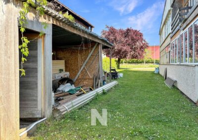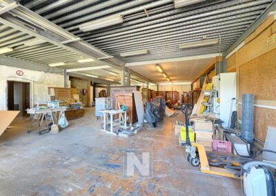 1 grand espace pour atelier ou autre, 1 bureau, 1 WC et douche, 1 vestiaire, 1 magasin, 1 local technique avec chaudière